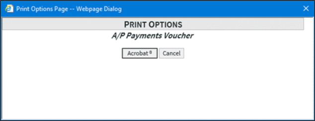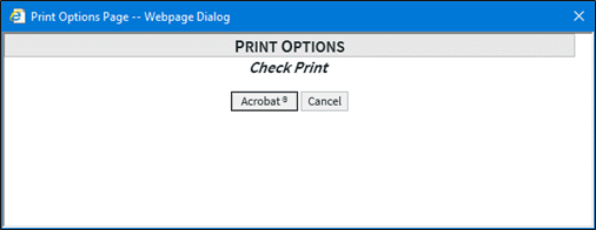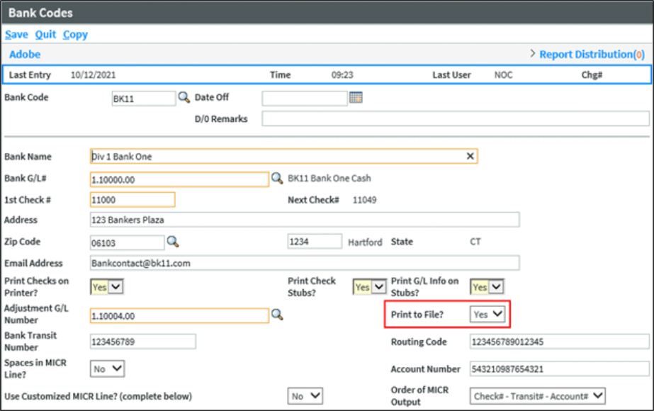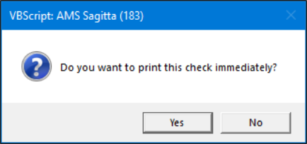 A new field, Print to File?, has been added to the Bank Codes page. Choose the Yes option in the Print to File? drop-down to suppress the prompts to print the PDF, or to print directly to the printer when printing checks, check vouchers, and check reports. Even though these prompts are suppressed, the check is created in Sagitta, and general ledger accounts are affected, as usual. The list of checks to be printed is created via a Report Builder statement, and output from the statement is sent to the party that will print the checks.