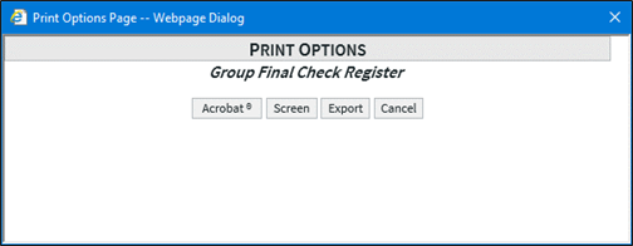 You cannot enter bank codes that do not have the same Print to File flag set in Bank Codes in a multi-line Bank Code textbox. The following programs allow multiple banks and will display the error, "Cannot run report when banks have different Print to File flags!" when selecting Adobe, Print or Export: