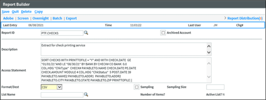 The report builder, PTF.CHECKS, has been pre-loaded into Sagitta. Use this report to generate a report in CSV format that lists checks that were generated for a bank that has the Print to File? flag set to Yes. This CSV report can be forwarded to a third party for issuing checks offsite.