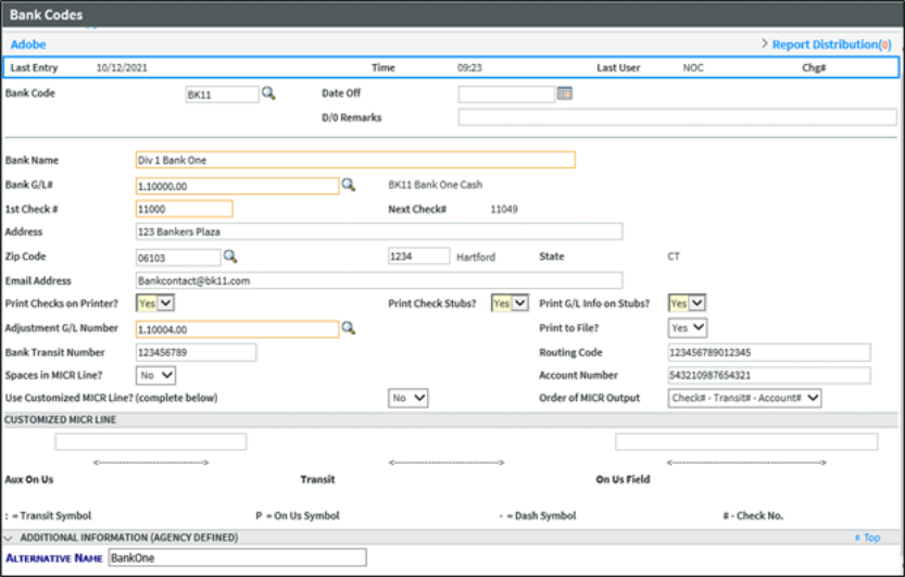 | User-Defined Data | Additional fields can be added to Bank Codes. |