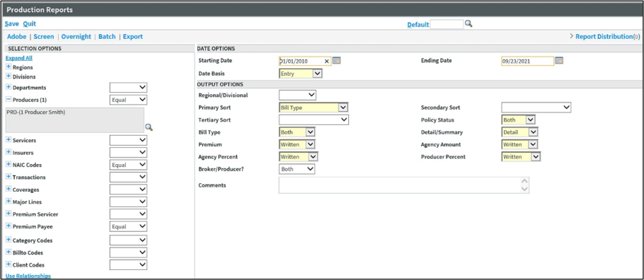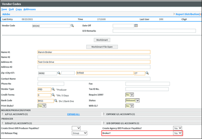 When the Broker/Producer? field is set to Producer, the report will include PRD-type vendors that have the Broker? drop-down set to No or Blank.