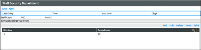 In the Division/Department grid, add the divisions and departments this staff code is permitted to access