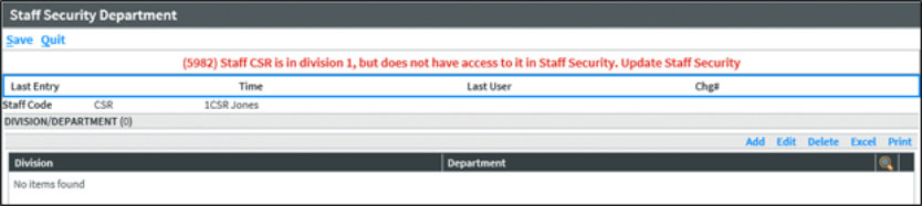 The user must be personalized for the division in Staff Security before any departments are personalized for that division for the user in Staff Security Department.